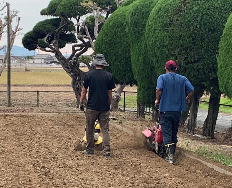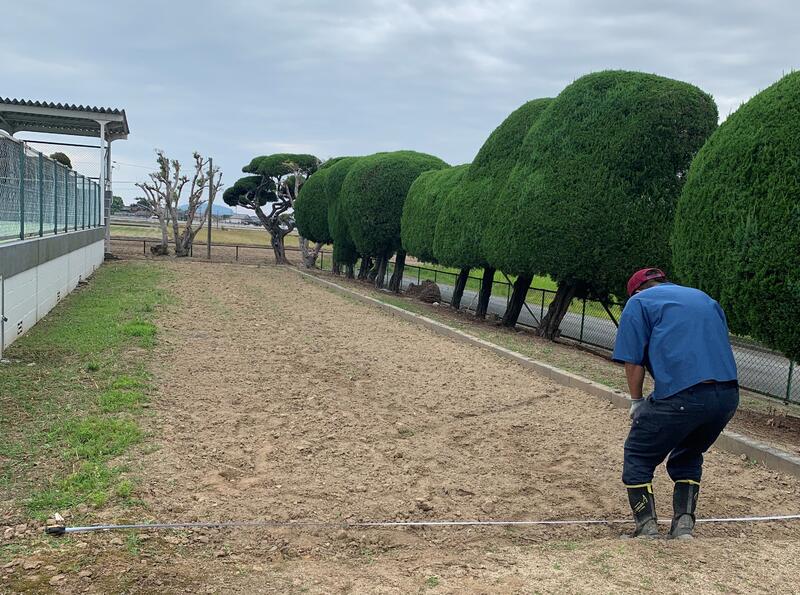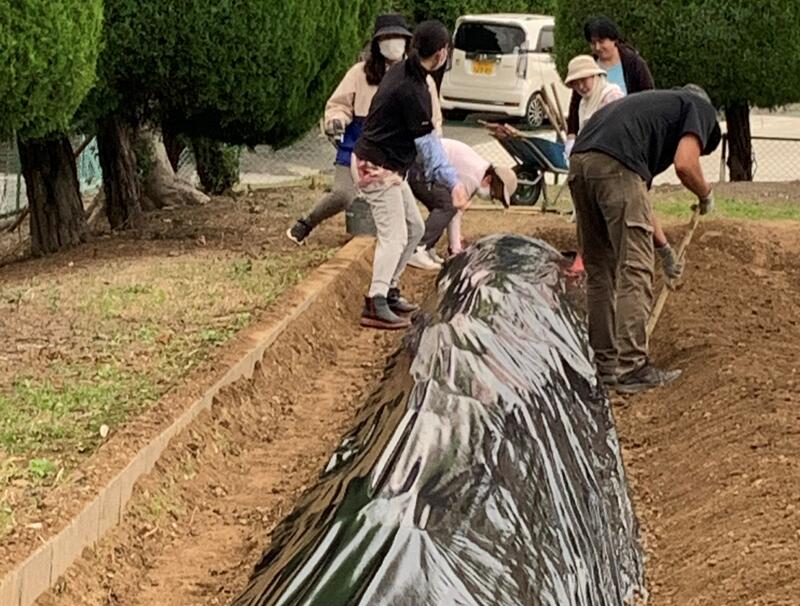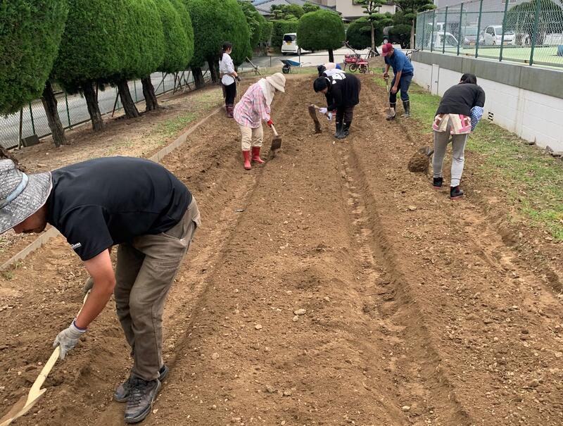 庁務手の先生が少しずつ耕していただいてたので、この日はいよいよ「ウネ」作りです。機械だけでは「ウネ」作りができず、スコップとクワで土を耕しました。「腰が・・・」「肩が・・・」「筋肉痛が・・・」という声もありましたが、「子どもたちのために」と、気合いをいれて作業をすすめて立派なイモ畑が完成しました。