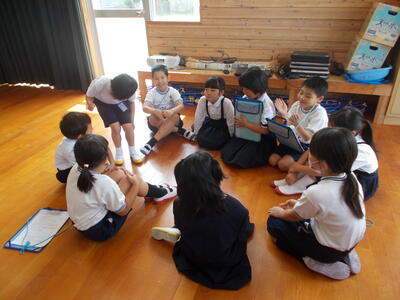 「1年生に、学校のことを たくさん教えてあげよう」と計画を立てて、とりくんでいます。