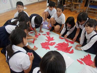 うんどう会をもりあげるために、1~3年生はテントにかざる「さんかくき」をつくります。