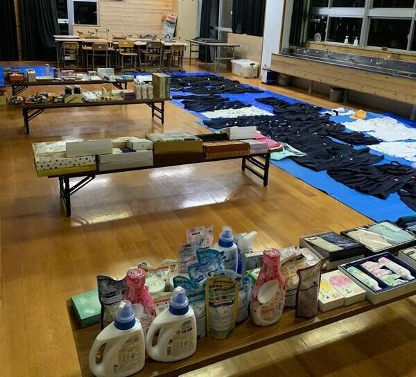 【多目的室いっぱいに品物がならびました!】