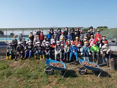 最後は とれたおいもと、お手伝いに来て下さった保護者さんと一緒に記念撮影。一輪車2台分とれました。