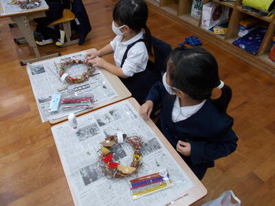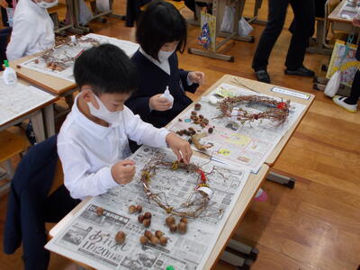 生活科で、あさがおのツルを使ったリースを作りました。どんぐりや落ち葉をボンドで貼りました。ボンドを使うのが難しかったけど、かわいいのができたよ。