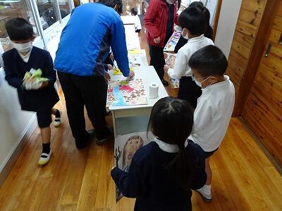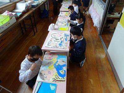 今日の1年生は、先日したいもほりの絵に取り組んでいました。HP担当がちょうど通りかかった時、廊下でいろんな色を使って、絵を仕上げているところでした。「ちょっとさむい~」と言っている子もいましたが、がんばっていましたよ。