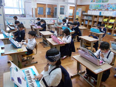 Teamsを使って 1年生も 練習しています。イヤホンをつけて 先生やみんなの声に 耳を澄ませています。