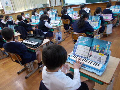 一日の始まりは「今月の歌」です。コロナ禍の中なかなか声を大きく出して歌うことはできませんが、朝の歌でみんなで一日をスタートします。5月の歌は「パプリカ」なので、1年生は踊りながら歌っていますよ!