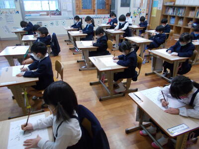 書初め大会に向けて 練習が始まりました。1年生は「ふじ山」と書きます。