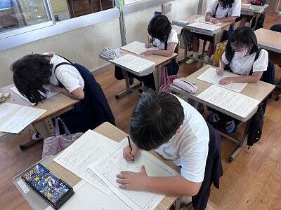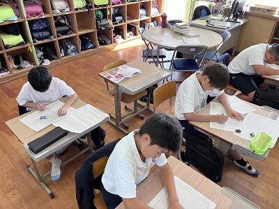 今日の5時間目は、読書感想文を書きました。宿題でしておいたメモをもとに、1時間で集中して書きました。ちょっと終わらなかったけど、みんながんばって書きました。がんばっているので、カメラなんて気にしてられません。なので、後頭部または頭のてっぺんばかりが写った写真となりました。