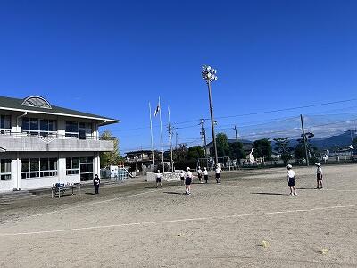 体育は持久走の練習も少しずつ入れつつ、フットベースボールの学習に入りました。まずは基本のルールを覚えるために、4つの少人数のチームでゲームをしています。走るか、やめるか、ボールを投げるか、なげないか、追いかけるか、やめとくか・・・・などいろいろまだ迷いつつの試合です。
