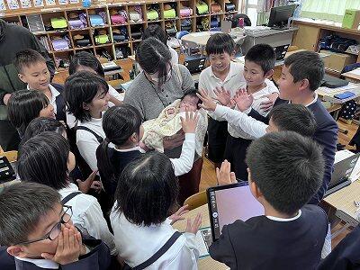 今日は育児休暇に入られている担任の先生が、教室を久しぶりに訪ねて来られました。小さな同伴者をつれて!