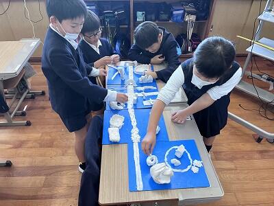今週の図工では、粘土で想像を広げていろいろな街を作りました。名付けて「ねん土マイタウン」。最初は「なかなかうかばないな~」という感じもありましたが、みんなでアイディアを出し合いながら、2時間かけて、それぞれいろいろ想像を広げて、自分だけの街が出来上がりました。
