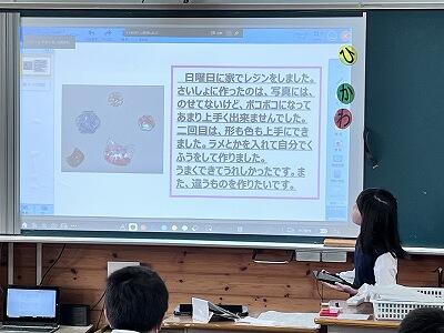 日直さんは事前に自分でスライドを作成し、それを電子黒板につなげて、それを見せながら発表します。とうぜん話す量もぐーんと増えました。聞いている友達も興味津々で聞いてくれているようです。