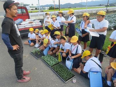 大きなハウスの中に何千もの苗が植えられているのを見せて頂きながら、1年間の仕事の内容や工夫していることなどを伺いました、子供たちもいろいろな質問を出して、しっかり話を聞くことができました。中にはお手伝いをしたことがある子もいたので、更にいろいろくわしく話も聞けたようです。いちごがしっかり育つ土づくりと水の管理が大事だということが特にわかりました。