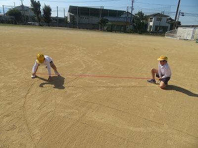 算数は円の学習をしています。ノートに円をかくにはコンパスをつかうけど、運動場のような場所に大きな円をかきたい時はどうするかを考えて、実際に描いてみました。「運動会とかでは先生たちもするよ~」という話もしながら、何とかやり方を考え、それを実際にやってみました。