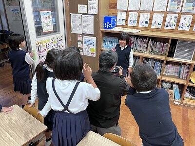 見学旅行に行く前の教室。2人のお友達がカメラを前に「ピース!」。それをわやわやと見ている子どもたち。何かの写真をとっています~。その写真は学校の廊下のどこかに掲示されています!