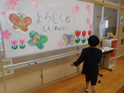 6年生が かいてくれた 黒板をまじまじと ながめています(ありがとうございました。)