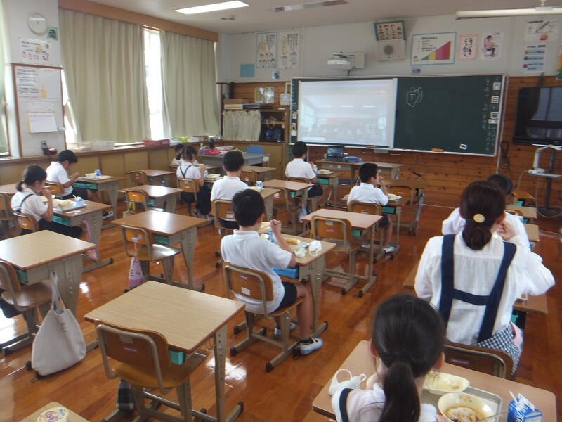 Teamsのテレビ会議機能を使い、画面越しでお互いに顔を見ながら食べました。子どもたちは、初めての出来事でなんだかうきうき!楽しんで食べていました♪