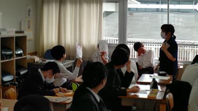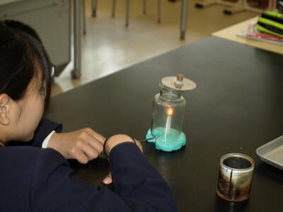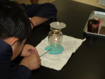 「ものの燃え方」の学習で、びんの中でろうそくに火をつけると、その後どうなるか実験しました。また、ろうそくの火が燃え続けるにはどうしたらいいか考え、実験で確認したり、せんこうの煙の動きを確認したりしました。