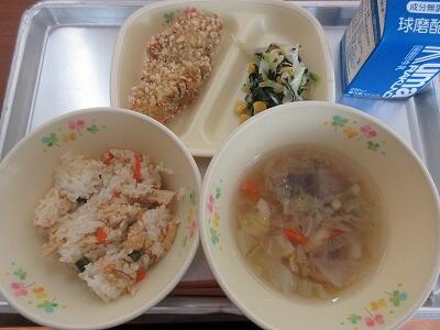 今日もおいしくいただきました。給食週間2日目は、宇城市三角町の郷土料理「びりんめし」でした。はじめて食べました。卵をいったものや油あげが入った混ぜご飯でした。「びりんめし」の由来は、豆腐をいためるときの音が「びりんびりん」と聞こえることから名前がついたそうです。明日のメニューは、ミニトマトから変更で「氷川町の白菜」を使った、白菜とリンゴのサラダです。楽しみですね♪