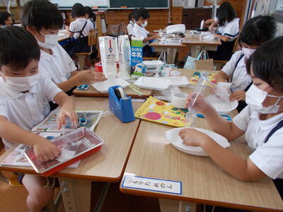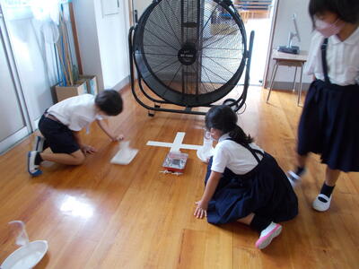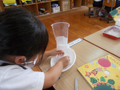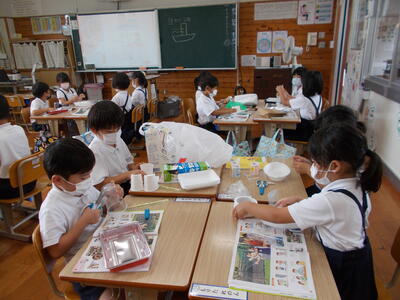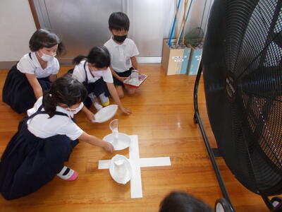 風の力ではしる ほかけぶねを つくりました。トレーやプラスチックのコップなどで つくりました。