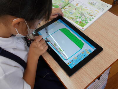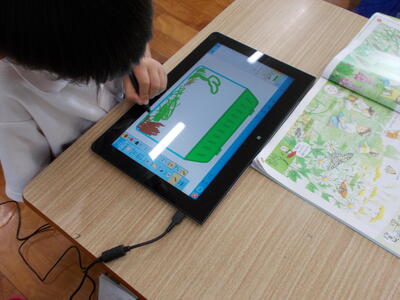 はじめに、タブレットでどんなおうちにするか、絵でかいてみました!