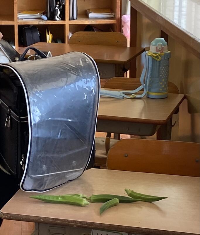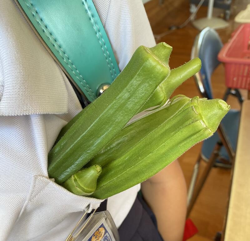 そうじが終わり花壇そうじの子が毎回大量のおくらを持ってきてくれます。