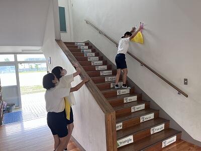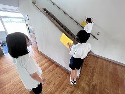 6時間目の低学年が帰ったあとの、ちょっと静かな階段で、6年生の3人組が何やら活動しています。