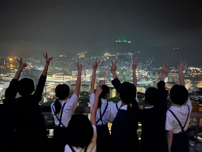 ホテルの夜はまたまた盛り上がっていたようですね~、なんと夜景を見ている写真が届きました。こちらはかなりの雨ですが、長崎はあまり降らなかったのかもしれません。明日の長崎の予報は、9時ぐらいまでの雨のようでしたから明日も期待できるかもですね。