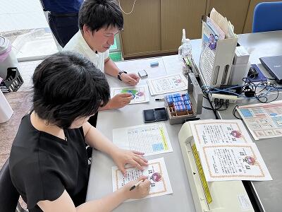 放課後は先生たちがさっそく、みんなの検定結果を点検して、それぞれの級の認定証を用意していましたよ。 |