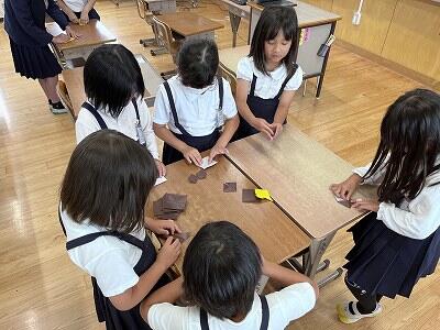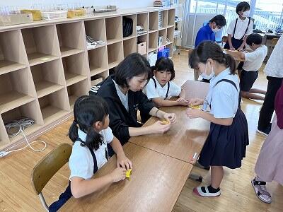 給食の時間の放送で「4・5年生でできる人は集まって下さい!」と呼びかけたところ、もちろん4・5年生も来てくれましたが、低学年のみんなもぞくぞくとやってきてくれて、たっくさんのみんなでひまわりの花づくりをしました。子供たちだけでなく、先生たちも来てくれましたよ~。