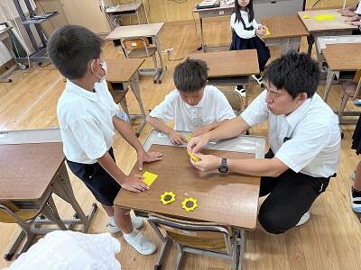 前の話題に「あいさつチャレンジ」という取組の掲示板に、目標が達成出来たらひまわりの花を咲かせる準備をしている話をのせましたが、その続きです。今日は6年生が修学旅行。なので、4・5年生にがんばってもらって、掲示に使うひまわりを折り紙で作ることにしていました。
