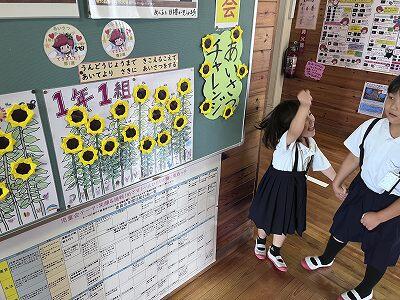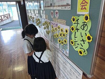 毎日あいさつチャレンジに一生懸命取り組んで、ひまわりの花を毎日ひとつひとつ増やしていくのを、ほんとに喜んでいた1年生。そんな一生懸命さが全校のみんなの心を動かしたようです。すごいな~。