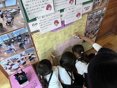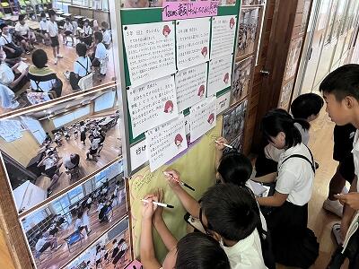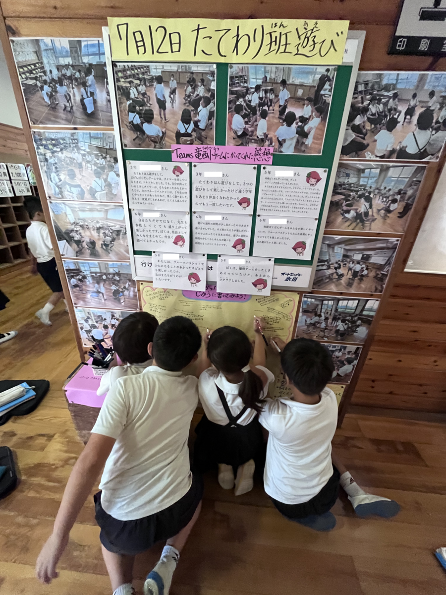 コーナーの一部には、その場で自由に書ける感想コーナーもつくったので、またたくさんの子どもたちがたてわり班遊びの感想を書きこんでくれました。「ゲームがどきどきした」「仲良くなれた」と楽しかった!の声が多かったので、ぜひぜひ2学期もたてわり班遊びやってみたいですね。