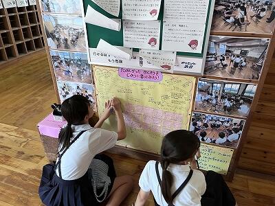 先日大いに盛り上がった「たてわり班遊び」。その楽しさを今一度みんなで共有しようと「たてわり班掲示板」が新たに登場し、第2回のたてわり班遊びの様子を写真と子どもたちの感想で掲示しました。たくさんの子どもたちが見に来てくれました~。