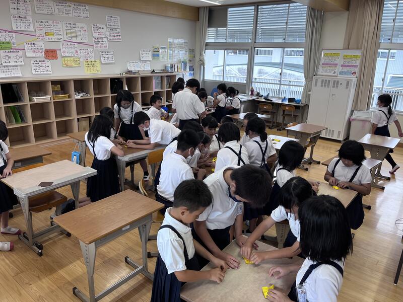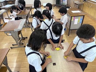 そこで、掲示板に咲かせる「ひまわりの花」をまたたくさん作ることにしました。給食の放送で全校に呼びかけると低学年の子供たちを中心に花づくりに集まってくれました。