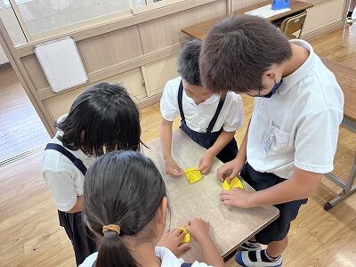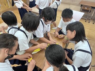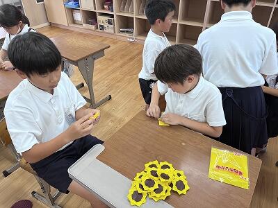 やっては来たものの作り方のわからない6年生、あとは低学年の子供たちにつくり方を習うしかありません。そこで俄然やる気を出してきた1・2年生の子どもたち。「あのね!!最初はこうするんだよ!」「そしてここはこう折るの!!!」とたじたじの6年生にまくしたてるように話しかけて、ひまわりの花の折り方を次々に教えてまわります。