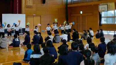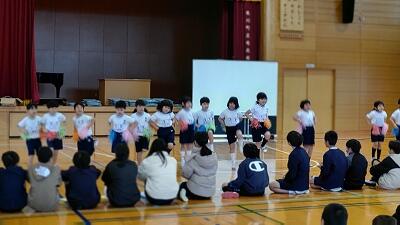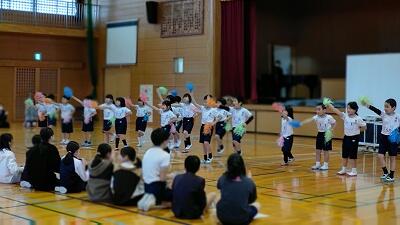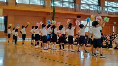 「とり」をかざった1年生「とり」にふさわしい「チアダンス」で 中学校にしん学する6年生に エールをおくりました