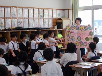 みんなでがんばって色をぬった、ひまわりの絵のプレゼントを2年生にわたしました
