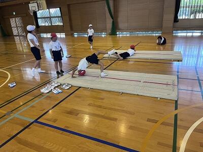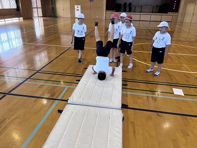 今日は体育、マット運動の練習中です。前回は、撮り忘れた練習の様子を少し写真に撮りました。最終日にはみんなで発表会をするので、技をいろいろ練習しています。今日は何人も倒立技にチャレンジしていました。そして後半には2つの技を連続でするなどの様子も見られました。