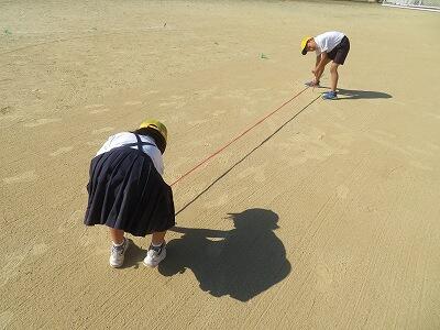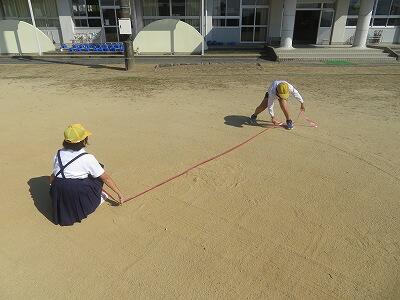 算数は円の学習をしています。ノートに円をかくにはコンパスをつかうけど、運動場のような場所に大きな円をかきたい時はどうするかを考えて、実際に描いてみました。「運動会とかでは先生たちもするよ~」という話もしながら、何とかやり方を考え、それを実際にやってみました。