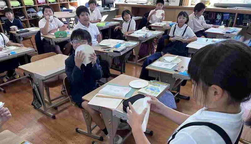 紙皿をちょうど半分、直径に沿って折り曲げるのは「ぎょうざまげ」だそうです。そしてそれを更に半分に折るのは「すいか曲げ」。みんなで説明しあった結果、「ぎょうざまげ→すいかまげ」「ぎょうざまげ→開いて→もう一度ぎょうざまげ」をするとできるそう。算数的な言葉でいうと「半分に折って直径を見つけて→その半分のところが中心」そして、「直径を見つけて→さらにもう一本直径を見つけて、その交わりが中心」ということになりますね。みんなでしっかり楽しく考えることができました。