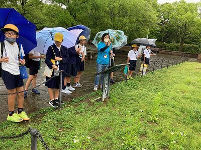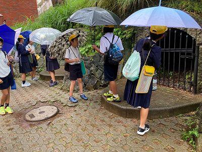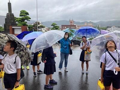 フィールドワークと原爆資料館見学の様子の写真が届きました。やはり雨だったようですね。でもひどい様子ではないかも。