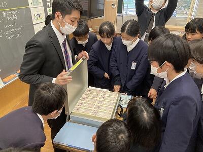 また、1億円(サンプル)が入ったケースも持ってきていただき、およそ10kgのものを持って重さを実感していました。