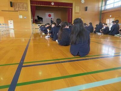 たいいくかんで 1ねんせいは「あおいせん」のうえに すわりますよ