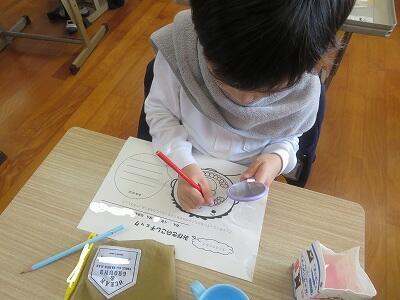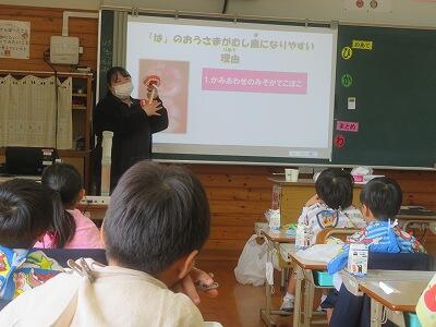 ブラッシングのじゅぎょうでは、「はのおおさま」を ていねいにみがく れんしゅうを しました