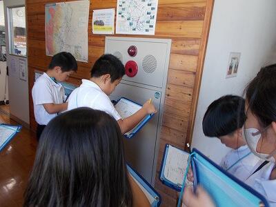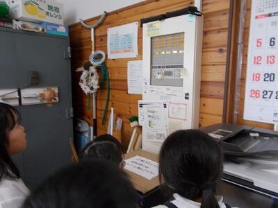社会の学習で、学校にある「消火器」「熱感知器」などの消防にかんするせつびを 見つけに行きました。