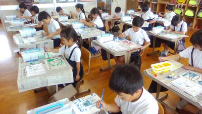今日は、待ちに待った絵の具を使った授業でした。道具の名前や使い方などをしっかりと学んでいました。