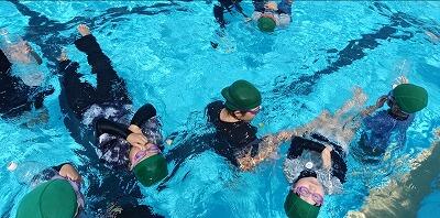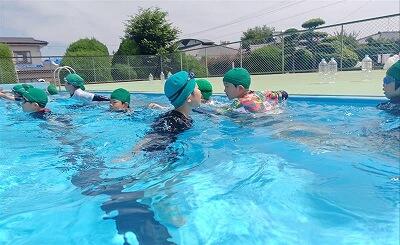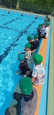 初めての大プールでより水の怖さを体験できたようでした。子供たちは、「服を着て浮くのは重くて大変だ」といいながらも、ペットボトルを持ったり、友達と手をつないだりして、大プールに入っていました。