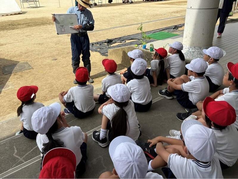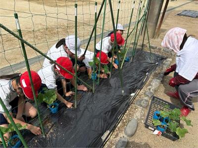 今日生活科の時間に、夏野菜を植えました。野菜のプロである地域の先生方にもお手伝いいただきながら、ミニトマト、オクラ、きゅうり、トウモロコシを植えました。