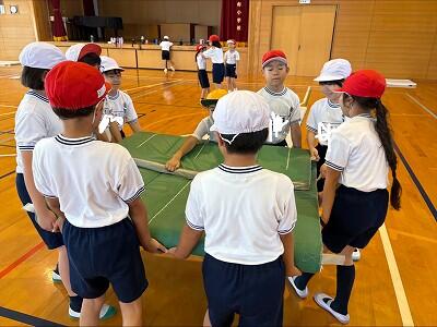 体育で「マットを使った運動遊び」を行いました。お家で練習した子供たちもいたようで、みんな上手になっていました。動物になりきって、転がったり、体を支えたりする動きをやってみました。