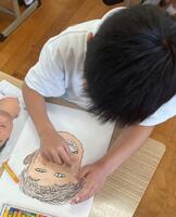 かくときは、眉や歯の1本1本まで丁寧にかき、色塗りでは、何色も色を重ねたり、指を使ったりと自分たちで試行錯誤しながら取り組んでいました。授業が終わっても、集中してかいたり色を塗ったりしている子が多かったです。